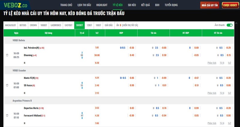 Trong cá cược bóng đá, tốc độ là yếu tố sống còn. Chỉ chậm vài phút thôi là kèo ngon trôi mất hoặc rơi vào bẫy. Vebo áp dụng hệ thống update real-time, đồng bộ với các nhà cái lớn như Bet365, M88, 188Bet, 18Bet, Macauslot, Sbobet… Nhờ vậy, anh em luôn nắm thế chủ động: